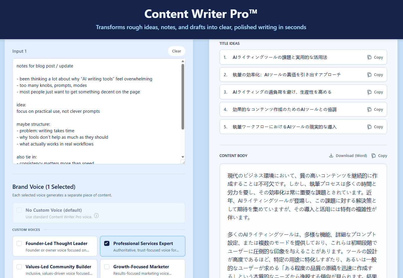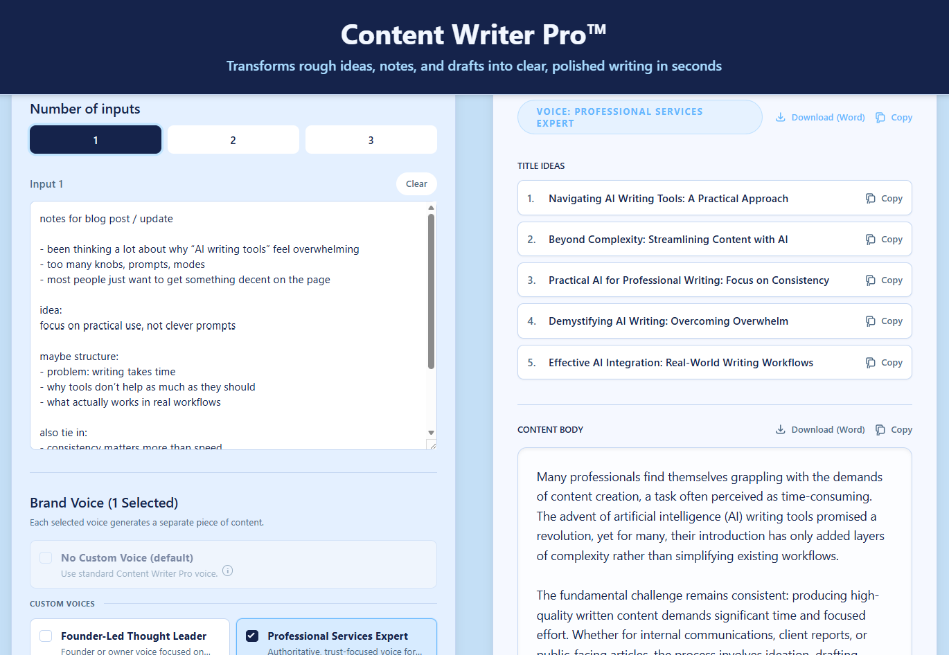 Paste in rough notes, drafts, or transcripts. Content Writer Pro™ structures and refines your input into professional output, effortlessly.