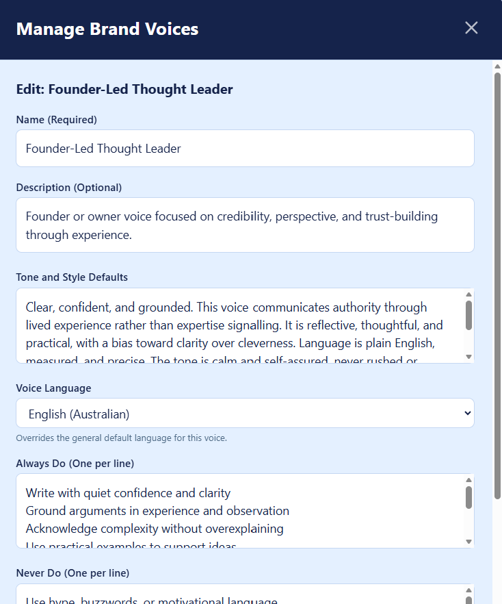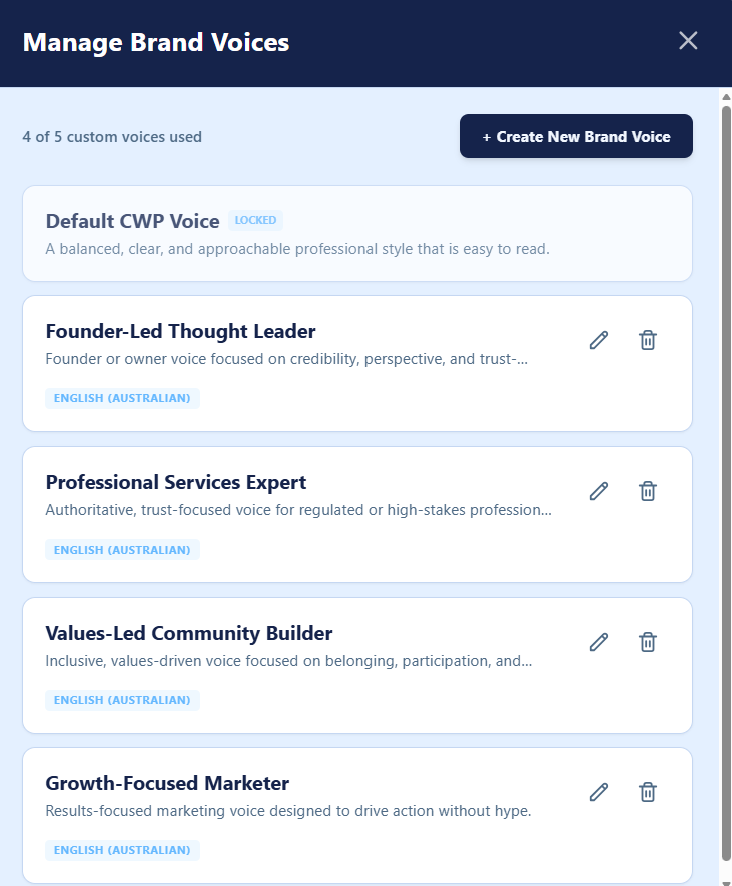 Writing style and tone are controlled through reusable brand voices, helping keep content consistent as topics or contributors change.