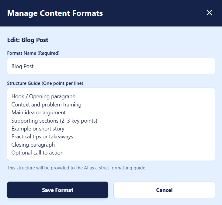 Define your own formats using clear section-by-section structure guides.