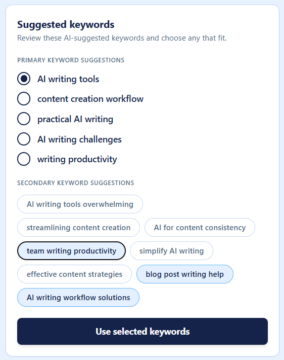 Incorporates keyword signals into titles and draft structure.