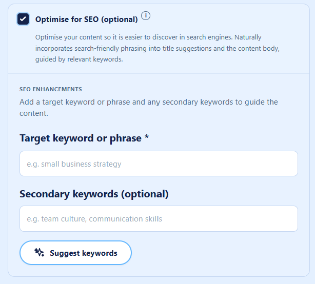 Content Writer Pro™ includes optional SEO guidance to support content discoverability when required.