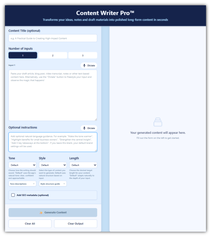 Content Writer Pro™ turns rough ideas into clear, polished long-form content in seconds.