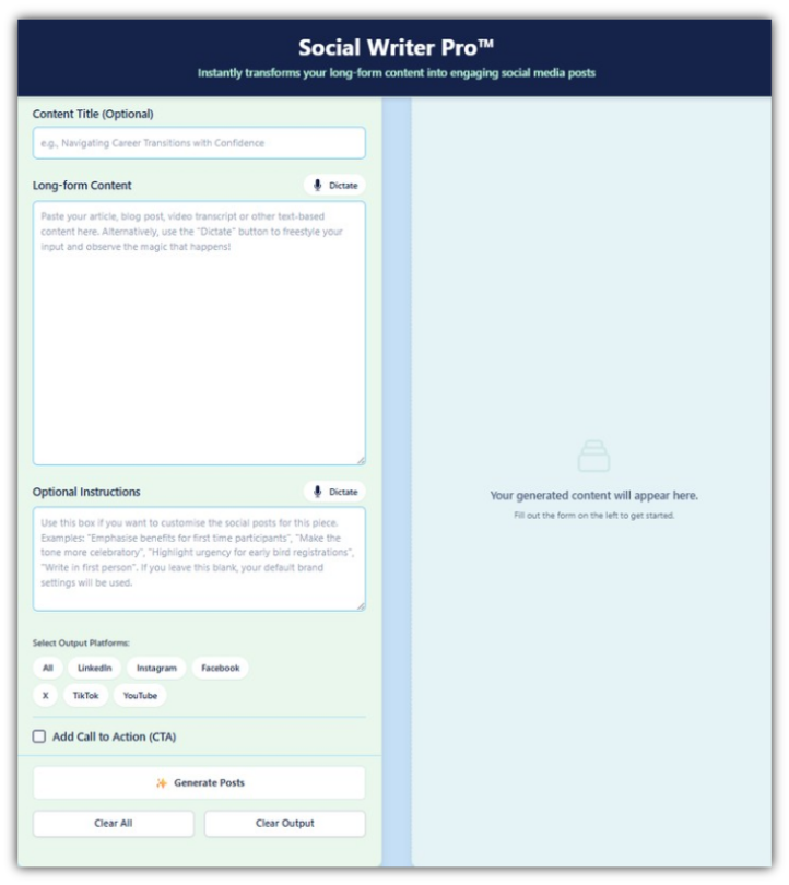 Social Writer Pro™ instantly repurposes that material into ready-to-publish social posts.